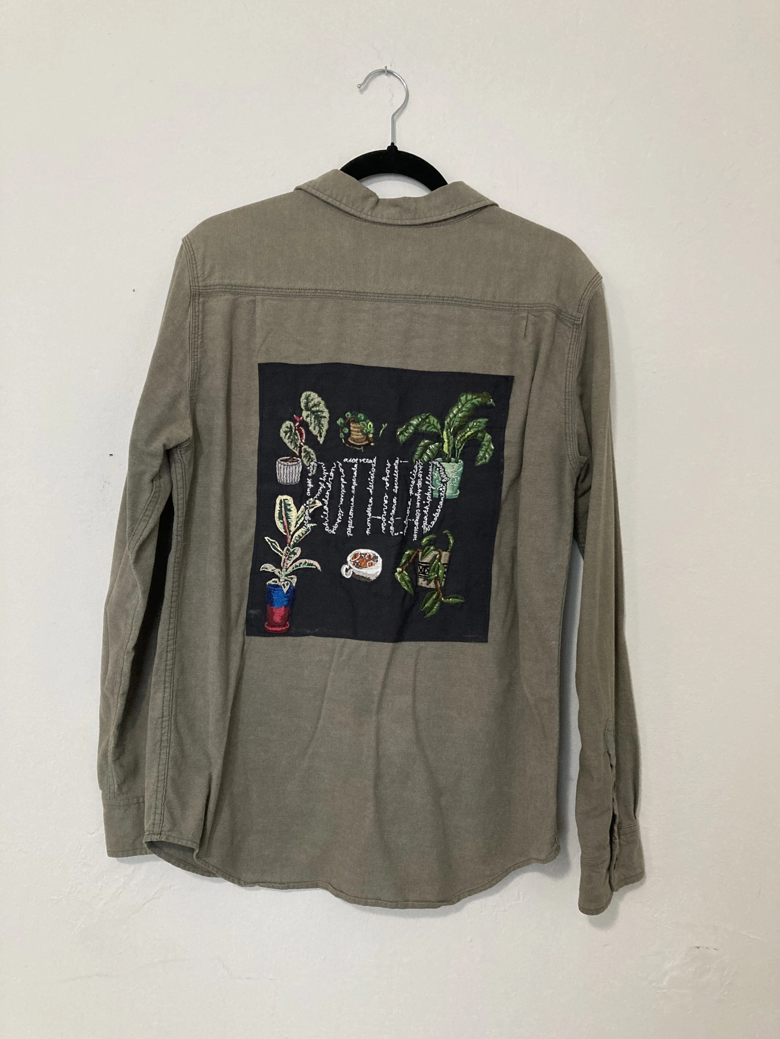 This one is super sentimental for me, and I constantly go back and forth on keeping it or selling it. I love the shirt, I love all those plants, I hand-stitched their names into words, I spent a lot of time on this and not just for the sewing part. It has been slightly sun-bleached, but I don’t mind the look at all.